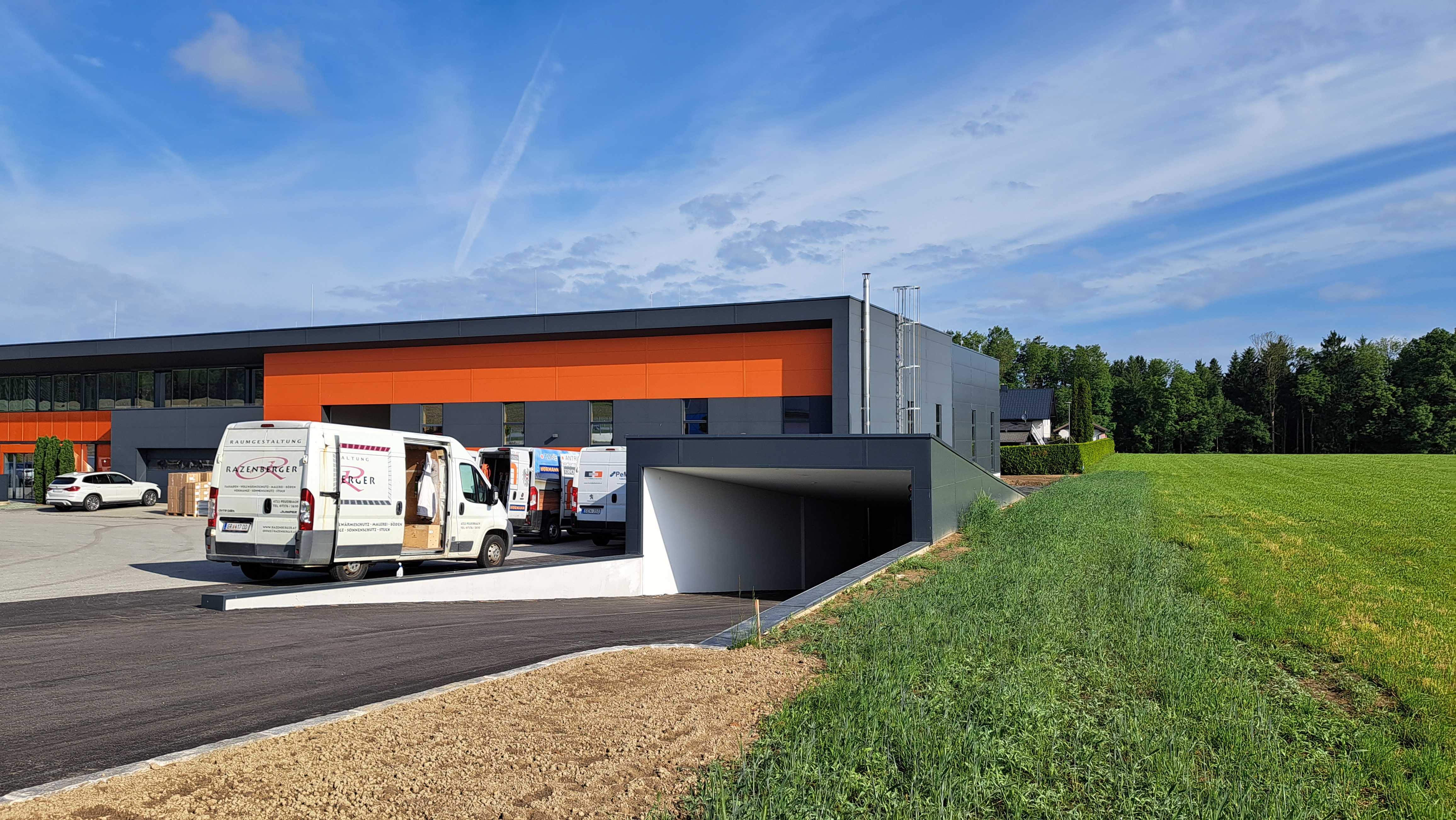 Das Gebäude sowie die Halle wurden ca. um mehr als 100% der Bestandsfläche erweitert und es wurde eine Tiefgarage, mit E-Ladestationen für die Mitarbeiter, ergänzt.